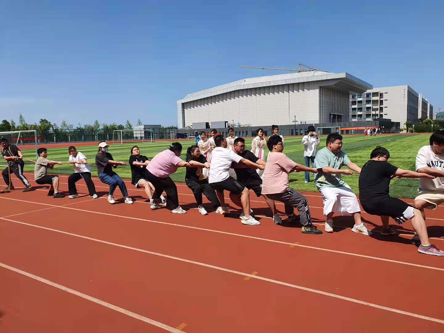 为培养同学们的大局意识,发扬团队协作精神和服务精神,在集体项目中,设置了如“万众一心”“齐心协力”“同舟共济”等比赛项目。我院学生顽强拼搏,发挥出强劲的实力以及不屈的精神,最终在“万众一心”项目中以3:0的好成绩夺冠。接下来“龙舟竞渡”和“同舟共济”的项目里,我院学生在足球场与对手竞速,彰显我院昂扬向上的斗志以及奋勇争先的干劲,最终获得第二名的好成绩。另外,“齐心协力”项目中,在整齐划一的口号下,通过大家的团结默契又拿到了亚军。整场气氛激烈又不失轻松愉快,参赛同学们全身心投入比赛,围观同学也时不时高呼助阵。