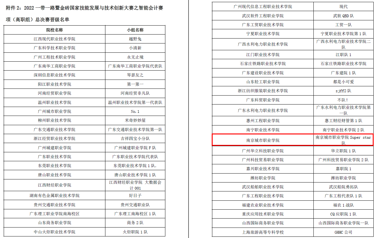 2022年9月24日,2022一带一路暨金砖国家技能发展与技术创新大赛智能会计赛项(高职组)及第十一届全国高等职业教育“网中网杯”大数据财务管理技能大赛全国初赛举行,来自全国高职院校的近400支队伍进行了激烈的角逐。我院2020级会计和财务管理专业的八名同学组成两支四人队伍参赛,比赛当日,八名同学在指导教师潘蓓老师和郁睿敏老师的全程陪同下,全神贯注地完成了七个小时的赛程,并取得了好成绩。9月28日,竞赛结果公布,两支参赛队伍均荣获二等奖(一队成员:20级会计专业郭宇强、徐祎帆、缪文静、魏情情,二队成员:20级财务管理专业张雪晴、戴欣、王宁、张美玲)。其中,一队取得了近几年我院在本赛项上的突破性成绩,顺利晋级全国总决赛。