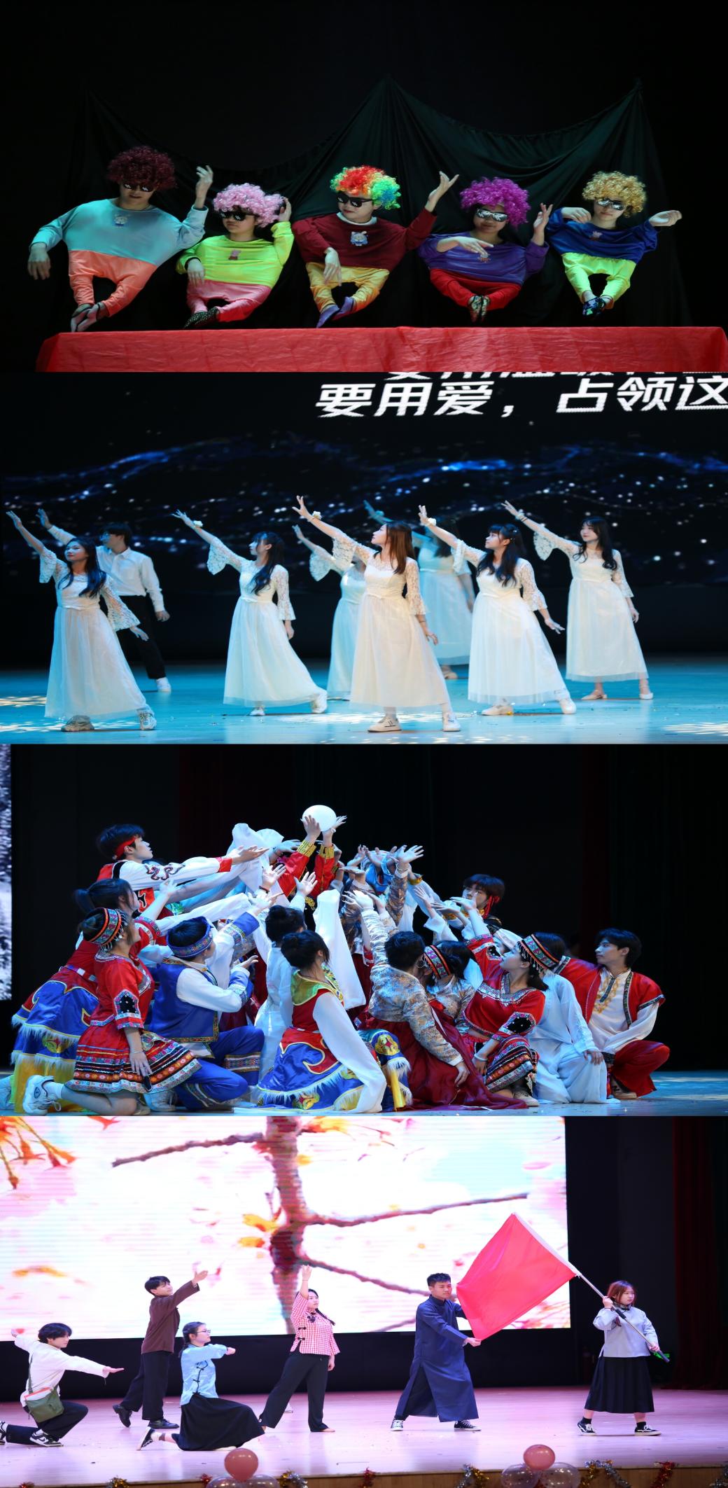 本次晚会精彩纷呈,历经数月的精心准备,最终为全体观众带来了一场视听盛宴。晚会伊始,一首歌舞表演《你要跳舞吗》拉开序幕,欢快的节奏、脍炙人口的歌曲瞬间点燃全场。紧接着由跆拳道社带来跆拳道表演《跆拳风》,整个表演姿势端正、动作流畅,具有力量感,充分展现了青年大学生的力量与朝气;《觉醒年代》朗诵气势磅礴地展现了一百年前一群热血青年为民族振兴抛洒热血的真切心情,让观众为之动容;手势舞《平凡天使》灵动生趣、宛转婀娜,静谧美好,同时也展现出疫情期间白衣天使以平凡之躯铸就不凡之事的伟大;一曲《是妈妈是女儿》温情走心,大屏滚动着同学们和家人之间关切的问候,收获不少观众的感动;舞蹈《left right》《舞动青春》动感热烈,燃炸全场,引起阵阵呼声;小品《你的模样》向同学们展现了支教教师最殷切的渴望——希望孩子走出大山,追寻梦想;《摩登秀》展现个性,释放魅力,俊男靓女让人移不开眼,场内气氛达到高潮……精彩的画面层出不穷,观众的呼声此起彼伏,现场的掌声连绵不断。最终在一曲《相亲与相爱》的歌声里结束了本次晚会,在场的领导嘉宾、表演人员、工作人员上台合影留念,为本次晚会画上圆满句号。