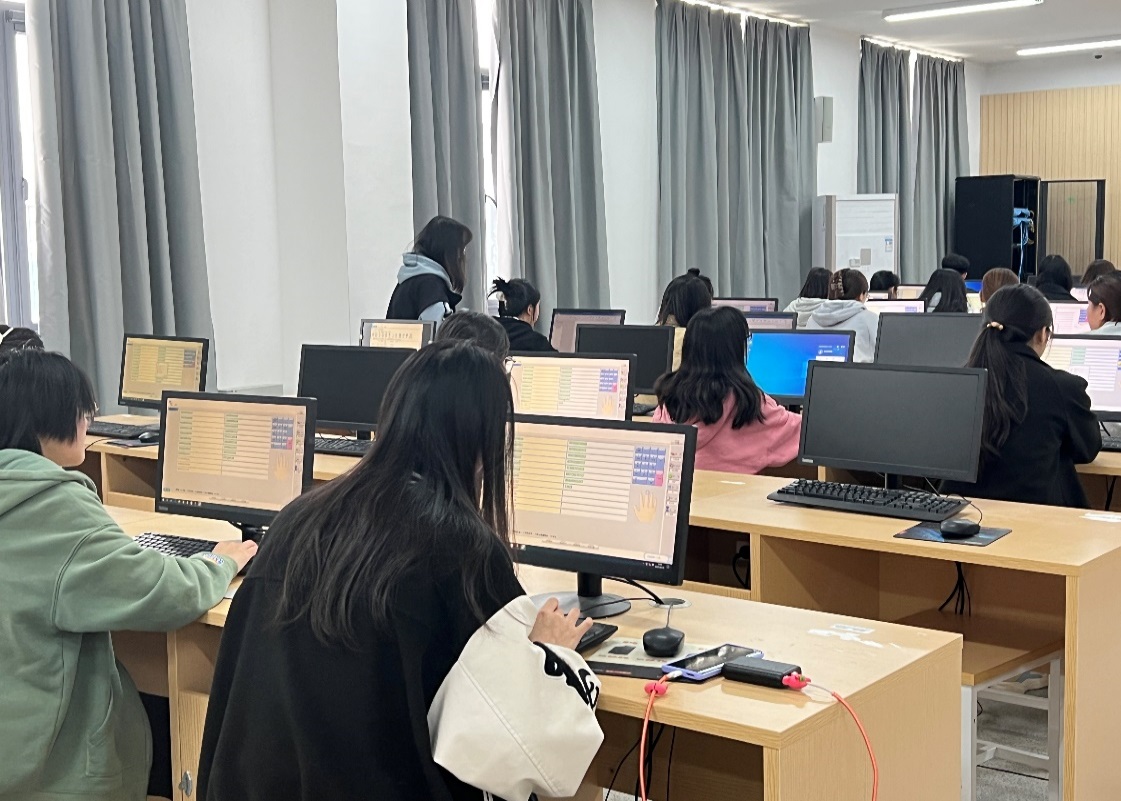 在比赛正式开始之前,大赛指导教师郁睿敏和袁哲茜两位老师,给参赛选手们强调比赛流程,希望选手们沉着应对,赛出水平。所有工作人员提前集合并布置现场,选手提前十分钟进入考场,在工作人员的提示下完成签到,并按指定位置进行入座。在主持人介绍完比赛的规则和要求之后,裁判发布“开始”的口令,所有选手快速进入状态,整个教室里只听到指尖在键盘上快速敲打的声音。当所有数据录入完毕,并在规定的时间内完成提交即可离开考场。