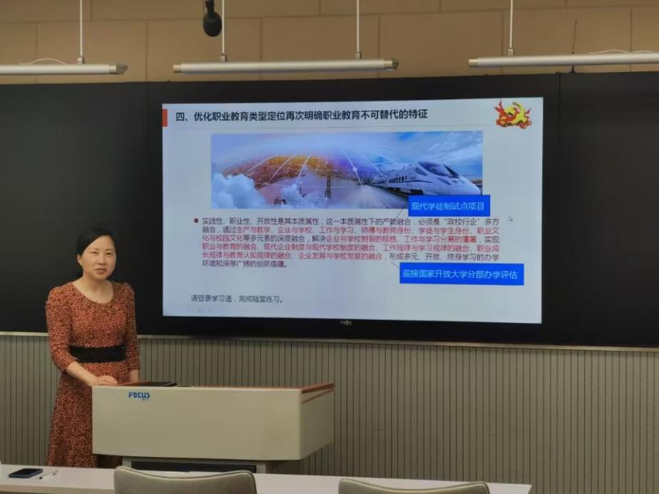 接着,滕静涛以《树立“四链”融合新生态下的“强校有我”志向》为题,给支部党员讲授专题党课。她以学习贯彻习近平新时代中国特色社会主义思想主题教育工作会议的重要讲话为引,详细阐述了职业教育教育链、人才链、产业链、创新链“四链”融合的新生态格局,进一步形成职业教育“职普融通”“产教融合”与“科教融汇”的发展思路,通过优化职业教育类型定位,明确了职业教育不可替代的特征;分享了学界提出的通过生产与教学、企业与学校、工作与学习、师傅与教师身份、学徒与学生身份、职业文化与校园文化等多元素的深度融合,解决职业教育面临的问题,形成多元、开放、终身学习的办学环境和深厚广博的创新底蕴;对应分析了当前我院在“四链融合”生态下已实现的重要突破及亟待破解的重要发展项目。