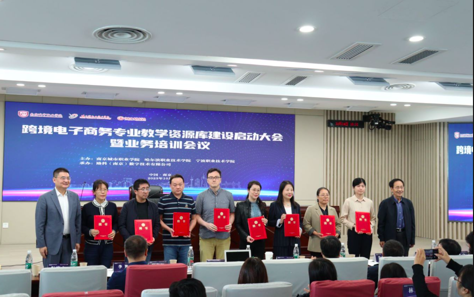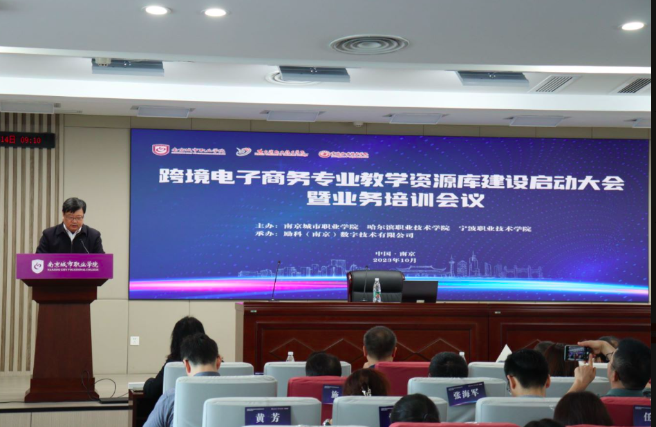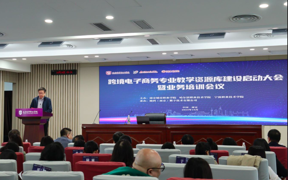 2023年10月14日,由mk世界杯_mk(中国)、哈尔滨职业技术学院、宁波职业技术学院主办,励科(南京)数字技术有限公司承办的跨境电子商务专业教学资源库建设启动大会暨业务培训会议在mk世界杯_mk(中国)顺利举行。会议由mk世界杯_mk(中国)党委委员、副校长江景主持,全国电子商务职业教育教学指导委员会常务副主任陆春阳,中国高等教育学会职业教育分会专家委员会、现代职业教育研究院专家委员会专家、二级教授于雷,国家级职业教育移动商务专业教学资源库、国家级职业教育“一带一路”贸易文化传承与创新教学资源库执行主持人吴洪贵教授,资源库联合主持、参建单位相关领导,参建单位子项目负责人及骨干成员、mk世界杯_mk(中国)各二级学院教师代表等参加了此次会议。会议共设领导致辞、专家分享、资源库建设工作安排、子项目和课程负责人聘书发放等议程。