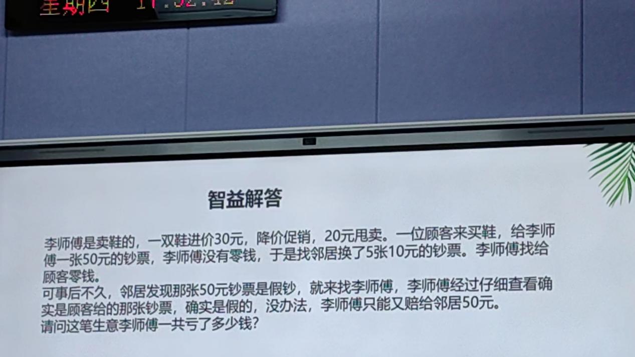 第二个环节是最强大脑、数学思想。规则是出一道益智题目,然后大家动用生活常识和计算来。本环节主要考验同学们的数学思维能力,数字是日常生活、学习和工作中很常见的内容,每个人都少不了要经常记一些数字资料。通过数字思维训练,能让同学们在面对数字资料的时候可以更轻松、更高效。