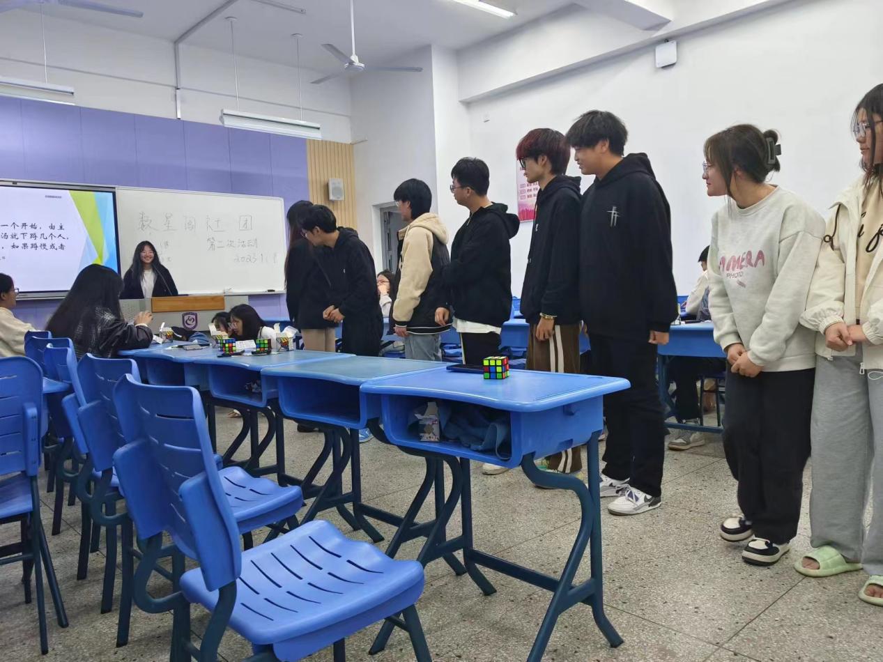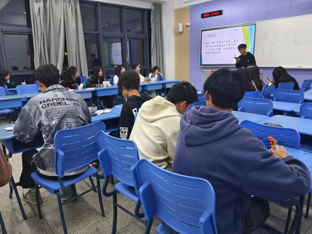 第三环节给同学们介绍了魔方的由来以及魔方的结构,同学们都集中注意力的听,后面社长加上部分社团成员指导大家复原魔方,经过一定的指导并且有多数同学都能通过自己独立的思考解答。本环节意在锻炼同学们的思维能力,希望同学们在欢快的娱乐之后也能迅速地恢复到学习中去。
