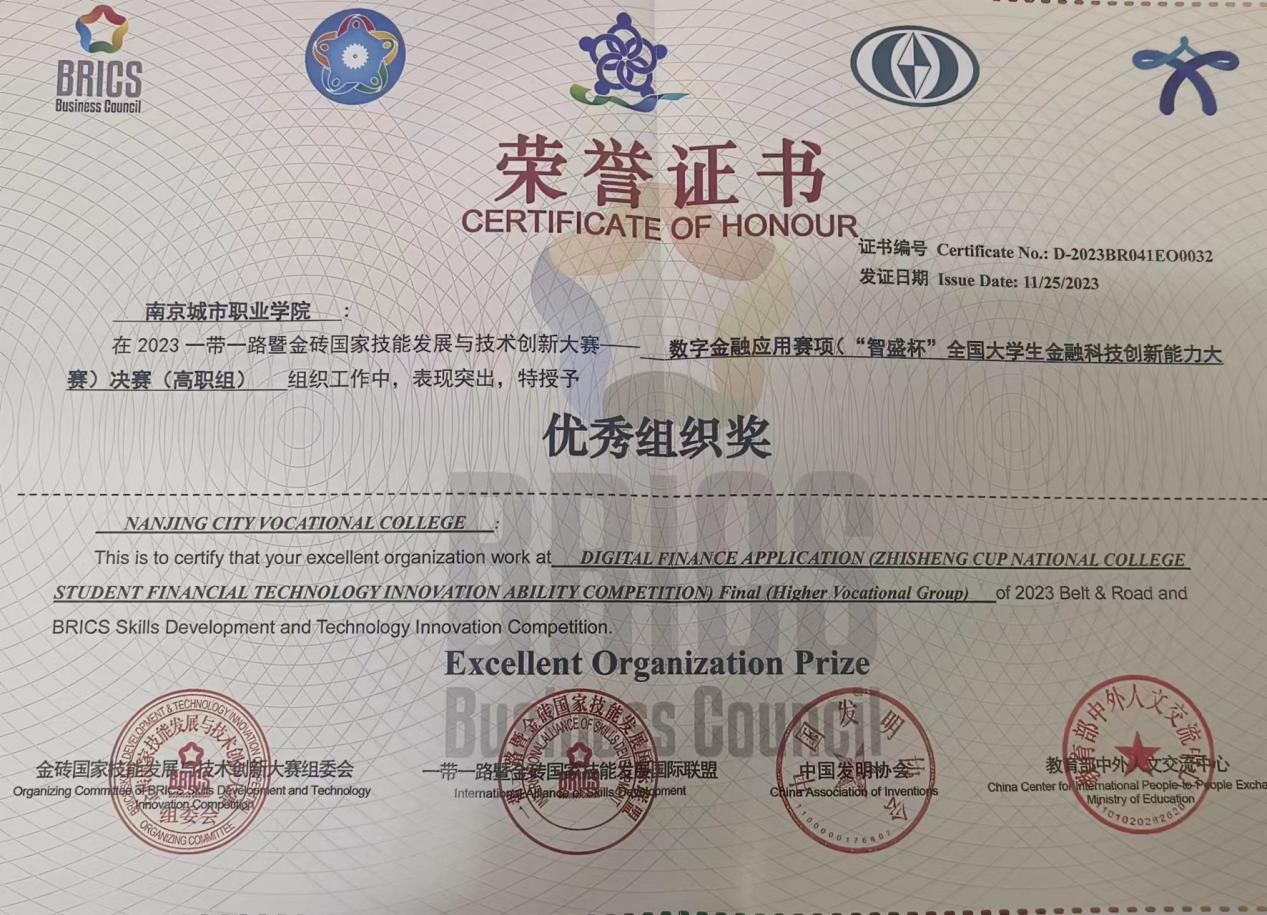 2023年11月25日,2023一带一路暨金砖国家技能发展与技术创新大赛数字应用赛项全国总决赛圆满落幕。我校mk世界杯_mk(中国)学生李奕琦、夏琦晶、黄缪鹏、张杰组成的代表队入围全国比赛队伍前20%,最终获得了高职组国家二等奖,江苏省高职院校排名第一的优秀成绩。学校因组织赛项表现突出,获得了优秀组织奖。
