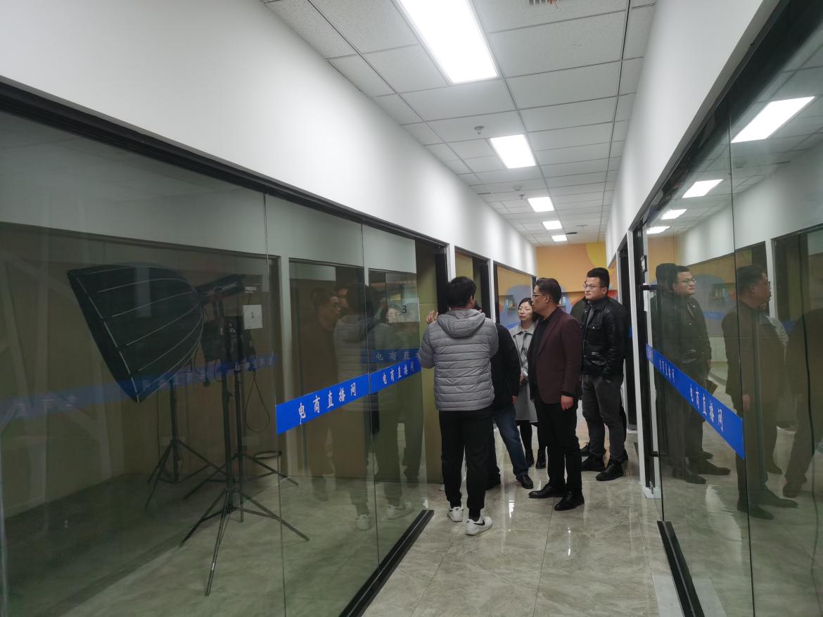 张达平一行在产业导师俞凡的带领下,参观了直播电商实训室,详细介绍了实训室的发展和运行情况。