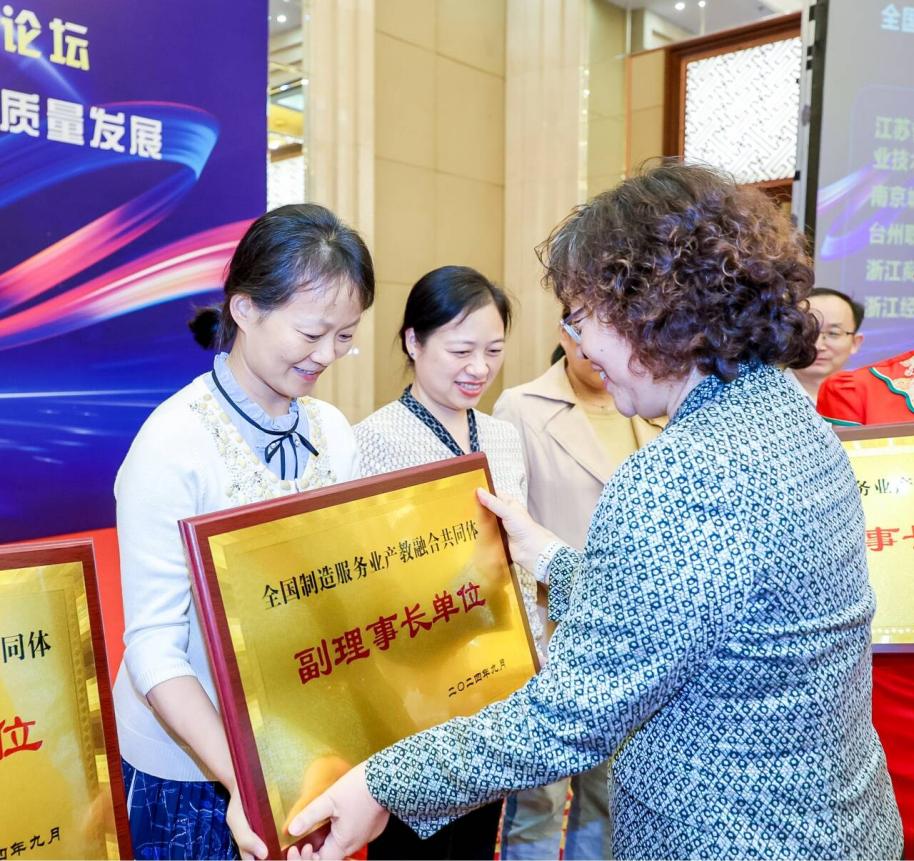 会议还举行了全国制造服务业产教融合共同体第一届理事会授牌仪式,对共同体成员单位进行了授牌。我校作为共同体核心成员单位,当选为副理事长单位。