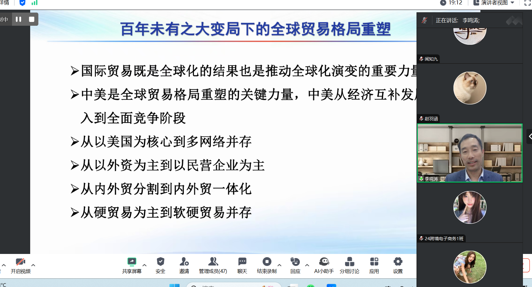 为正确把握资源库建设方向,推动省级跨境电子商务专业教学资源库建设及应用推广,数字财商学院特邀请资源库首席顾问李鸣涛教授于2024年11月14日晚,开展主题为“外贸大变局中看跨境电商新价值、新机遇与新政策”的学术讲座。江苏省职业教育跨境电商专业教学资源库参建教师代表、跨境电子商务专业部分学生共计200多人以自主或集中方式聆听了本次在线讲座,资源库主持人、我校党委委员、副校长江景参加活动并讲话,mk世界杯_mk(中国)书记、院长刘红主持讲座。