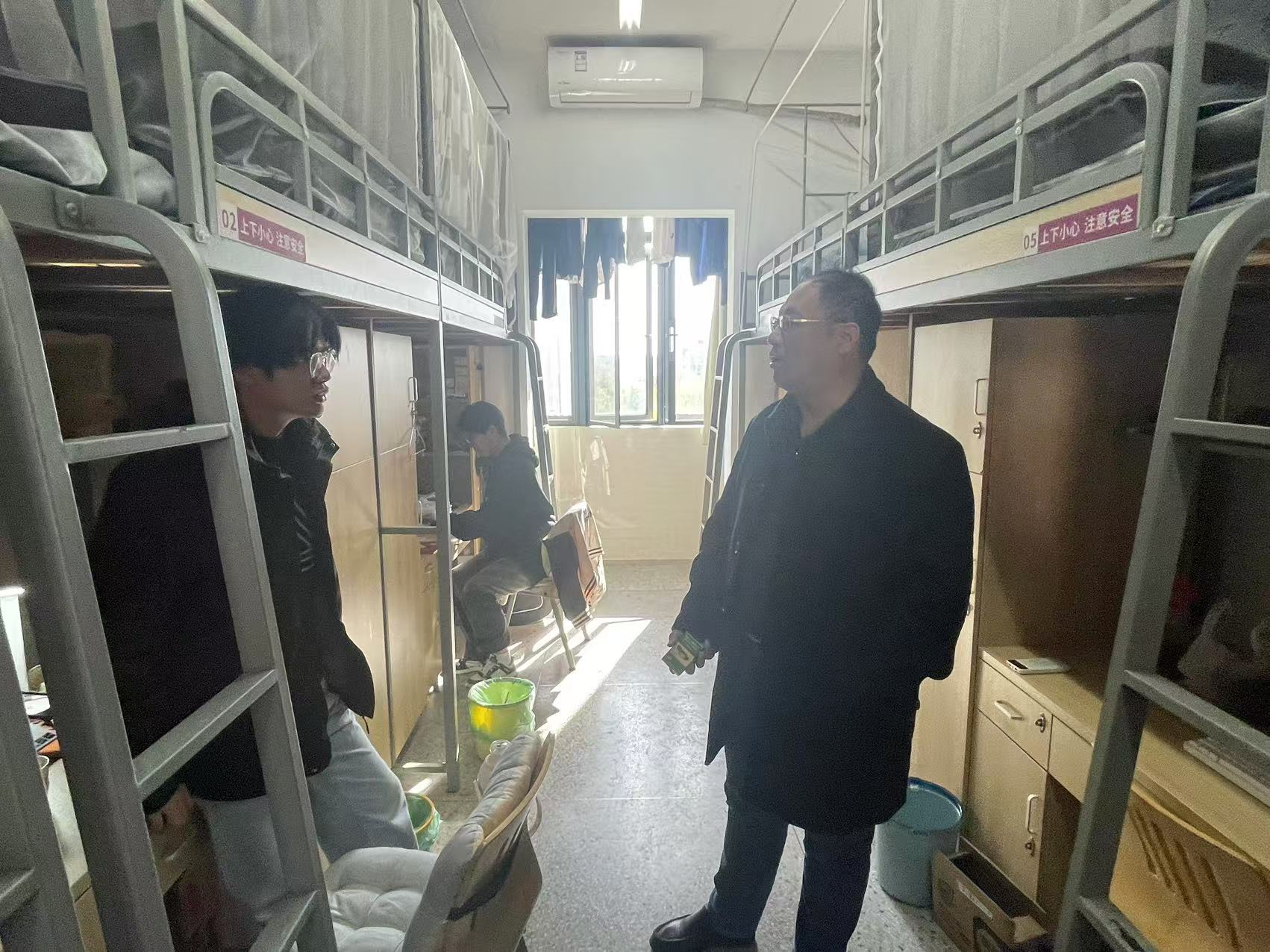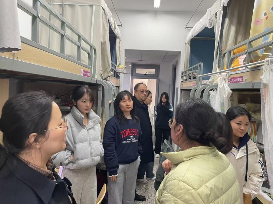 在走访宿舍期间,丁亮副书记和辅导员们还特别关心学生的生活与学习状况。面对寒冷天气,叮嘱学生们要及时增添衣物,注意保暖,预防感冒等疾病的发生。同时,考虑到学期末临近,鼓励学生们合理安排时间,制定科学的学习计划,积极投入期末备考中,争取在期末考试中取得优异成绩,为这一学期的学习生活交上一份满意的答卷。