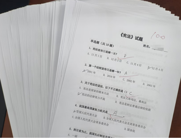 本次学习的最后阶段,全体教职工进行了宪法知识测试。测试内容涵盖习近平法治思想、宪法以及宪法在实际生活中的应用等多个方面,主要针对宪法的学习理解和掌握进行考核,让大家重温了宪法知识、检验了学习成效,实现了“以考促学、以学促干、学用结合”的目的。