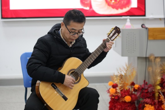 活动伊始,商数专业教师以一首《好运从四面八方来》的合唱点燃现场气氛,嘹亮歌声传递着对新年的美好期许,展现出教师团队的蓬勃朝气。随后,学生代表带来的朗诵《闪耀吧,青春的火光》,用激昂文字与饱满情感抒发青春梦想,彰显学子积极向上的精神风貌。曹望老师的吉他独奏《花儿为什么这样红》,指尖灵动,弦音悠扬,令观众沉醉于经典旋律之中。