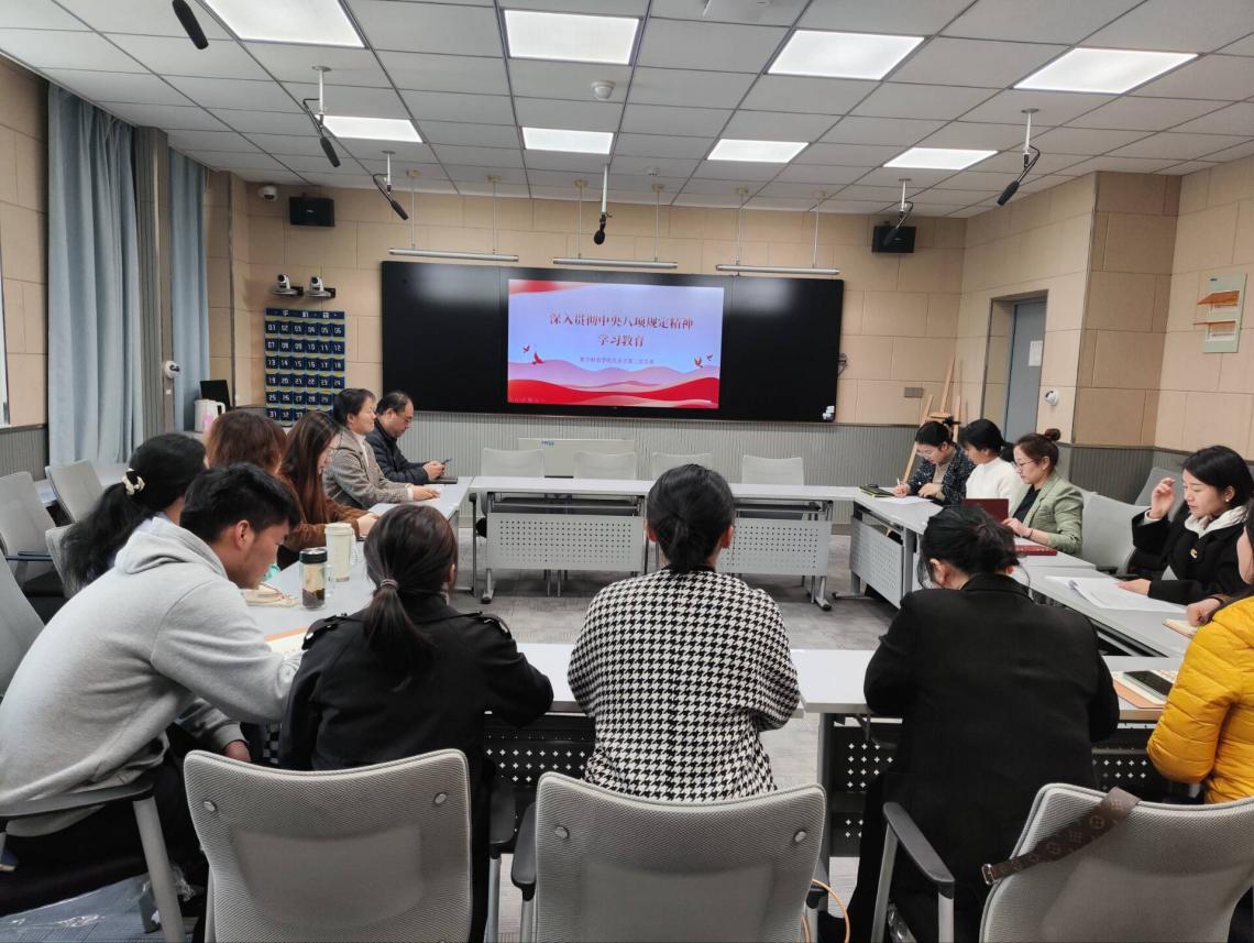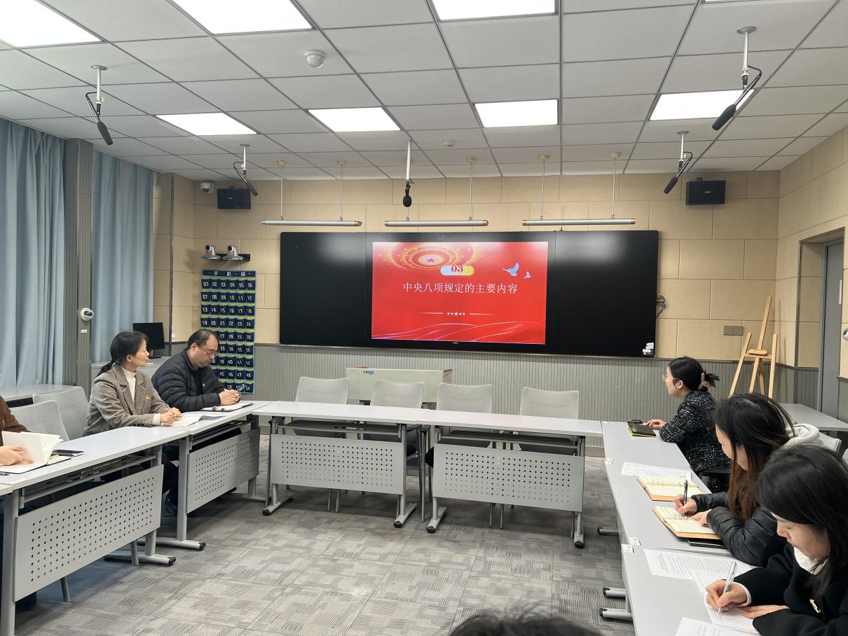 接着,支部委员蒋晓甜同志带领大家集体学习了《中央八项规定及实施细则》和《中央政治局关于改进工作作风、密切联系群众的八项规定》原文,并代表支部班子重点解读了学校《关于在全校党员、干部中开展深入贯彻中央八项规定精神学习教育的工作方案》。