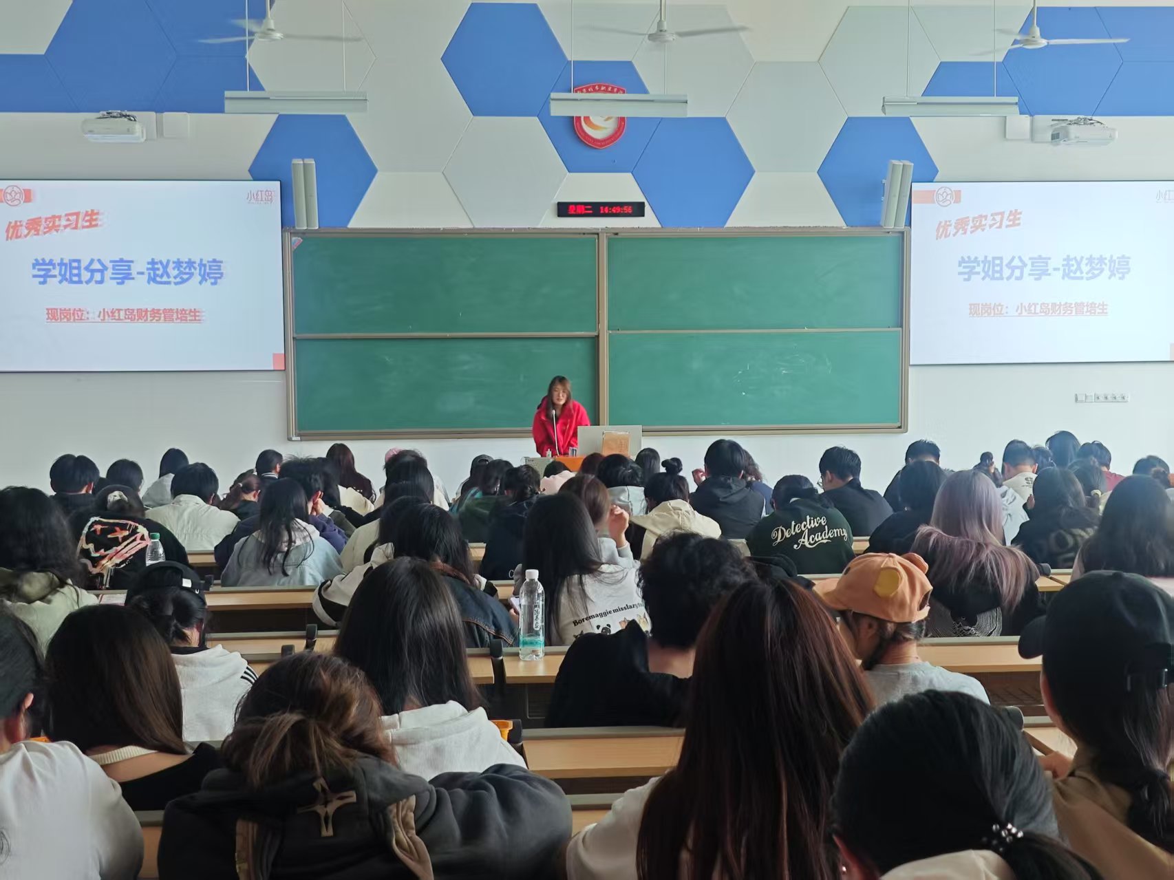2025 年 4 月 22 日下午,mk世界杯_mk(中国)在厚生楼 101 成功举办了一场主题鲜明、内容充实的优秀毕业生就业分享会。本次分享会特邀我院 2022 级大数据与会计专业优秀学生李岩和赵梦婷作为主讲人,他俩目前就职于南京小红岛超市,并在工作中取得了不俗的成绩,此次回校与我院 2023 级全体专业 390 名学生分享就业经验。