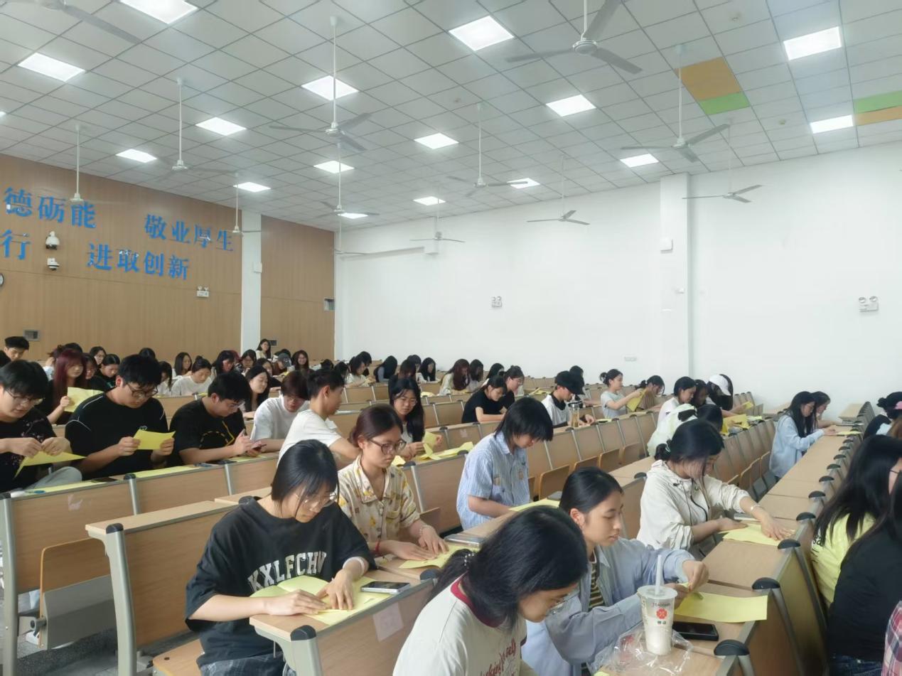 活动伊始,蒋晓甜老师以“初心如磐,使命在肩”为主线展开主题分享。她结合数字经济时代特征,深刻阐释了当代青年在职业选择与价值追求中的辩证关系:“纸飞机承载的不仅是祝福,更是数字财商人的精神密码——既要仰望星空锚定理想坐标,更要脚踏实地锤炼专业本领。”这一论述引发全场共鸣,现场掌声如潮。作为活动高潮的“折翼寄情”环节,将思政教育具象化为生动的实践场景。200余名学子伏案提笔,在特制信纸上书写对毕业生的祝福:“愿学姐带着Python算法的严谨与财务报表的敏锐,在金融科技领域劈波斩浪”“期待学长以区块链思维构建诚信体系,做数字时代的筑基者”……当一架架载着专业寄语的纸飞机划过会场上空,现场俨然成为跨越时空的信仰传承仪式。毕业生代表接过纸飞机感慨:“这些飞向未来的纸飞机,是学院给我们最珍贵的行囊。”